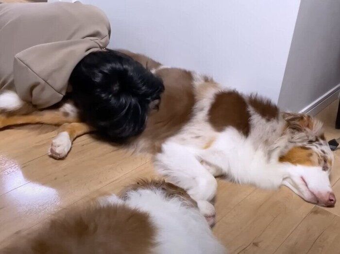 狭くてもママさんにくっついていたいボーダー・コリーとオーストラリアン・シェパード!!大きな体で甘えん坊な姿にほっこり
