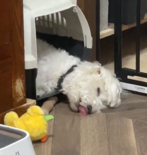 クレートのなかで眠る犬が舌をペロペロ 「おいしそうな夢を見ているの?」飼い主さんが直感した理由とは