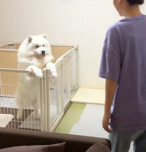 パパ&ママが帰ってきて、大喜びのサモエド・サニーちゃん。サークルから出るとまずはママにモフモフしてもらい、幸せそうな笑顔です。パパにも「おいで!」と呼ばれるとすぐに走っていきました。全身で喜びを表現している様子が微笑ましい動画です。