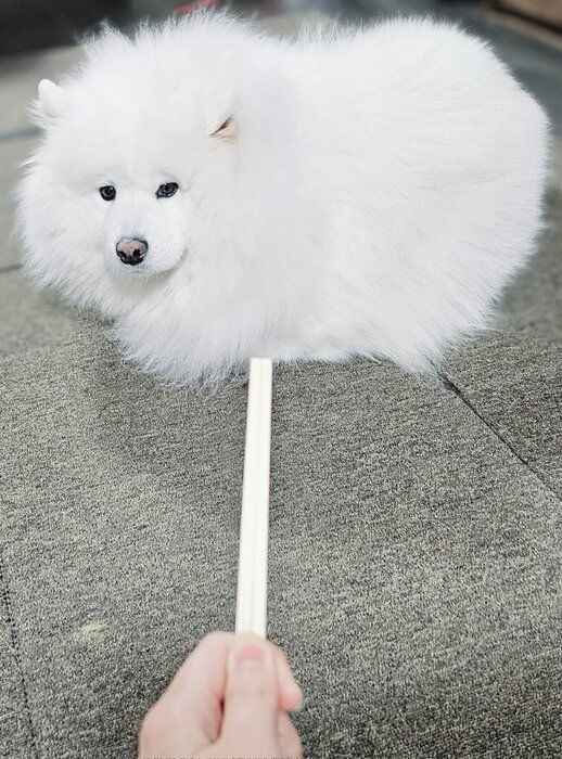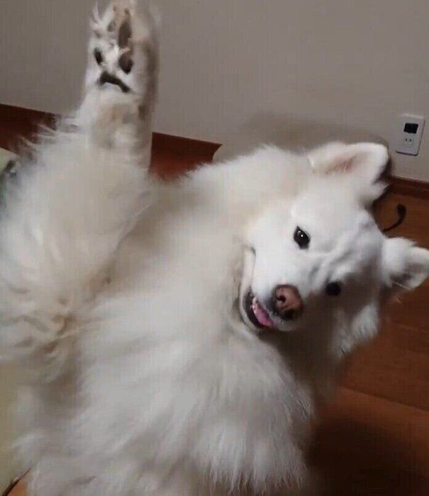 おやつをもらうときに「は~い!」とお返事のしぐさをするサモエド!元気いっぱいな姿が可愛すぎる!