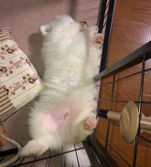 お迎え2日目の夜に「初ヘソ天」を見せたサモエド子犬 もうすぐ2才になる「成長した姿」が愛おしい!