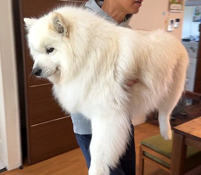 パパと体重測定するサモエド おとなしく抱っこされて無の境地?