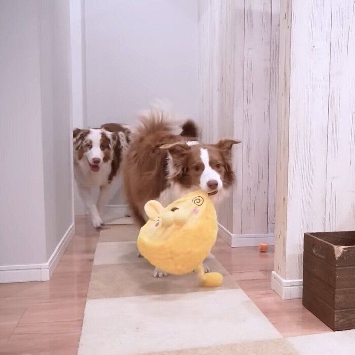 ボーダー・コリーのリーリエちゃんとオーストラリアン・シェパードのガルチェロくん。お庭でのピクニックのおともにママさんが用意したのは、ノーズワークが楽しめるお弁当型おもちゃ!おやつを隠すと、2頭はクンクンしながら楽しく遊び始めます♪動画です。