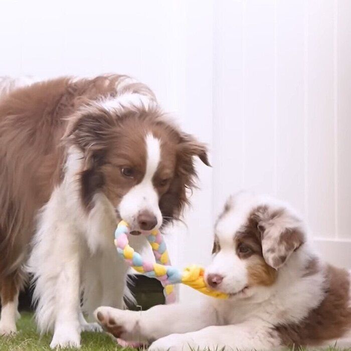 すっかり打ち解けた様子の先住犬のリーリエちゃんと、子犬のガルチェロちゃん。今日は初めて2頭でお庭で遊びます。ヒモを引っ張りっこしたりと、上手に遊ぶ2頭。出会ってまだ一週間とは思えない仲良しぶりなのでした♡動画です。