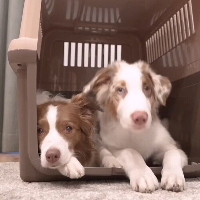 突然、猫のように段ボールに収まってしまったボーダー・コリー→そんな姉犬に困惑するオーストラリアン・シェパード!
