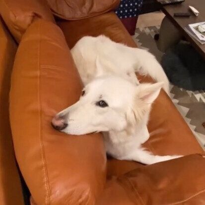 6才のお誕生日を迎えたホワイトシェパード!大好物のゴハンでお祝いしてもらい、まったりと幸せそうな時間を過ごす