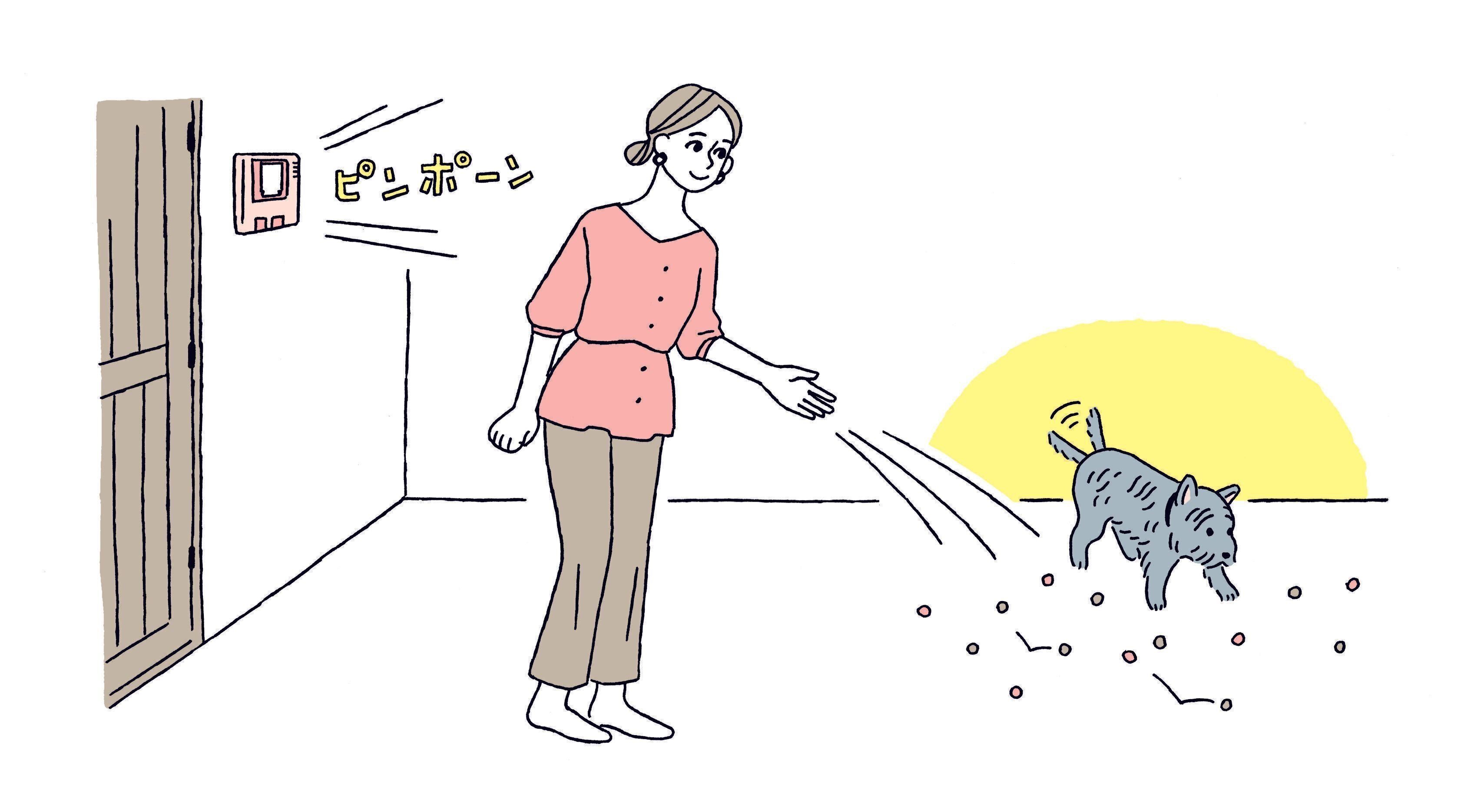 来客のチャイム音に吠える愛犬を静かにさせるために、フードをばらまいて気をそらす定番のしつけ。