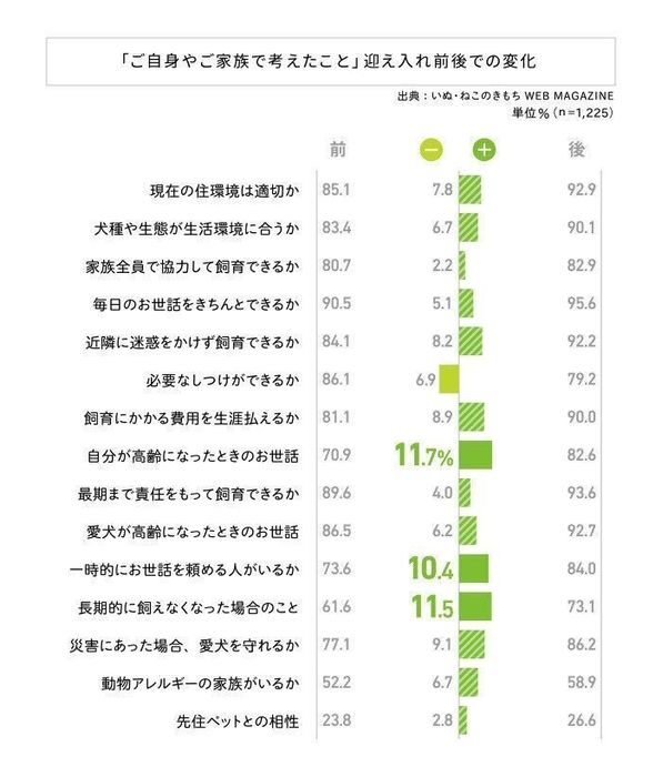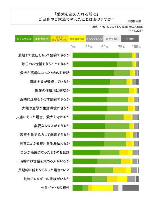 また、愛犬の迎え入れ前に「家族全員で協力して飼育できるか」、「犬種や生態が生活環境に合うか」「必要なしつけができるか」について考えたという割合も高く、「共働きなので、日中お留守番になってしまうことへのストレスがどのくらいか」という声も。