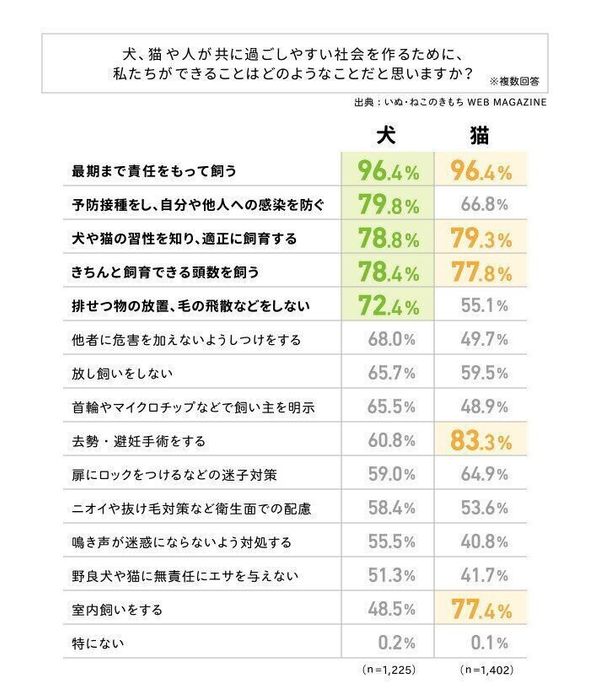 また「犬や猫の習性を知り、適正に飼育する」(犬78.8%/猫79.3%)、「きちんと飼育できる頭数を飼う」(犬78.4%/猫77.8%)も犬、猫共通で上位にみられました。