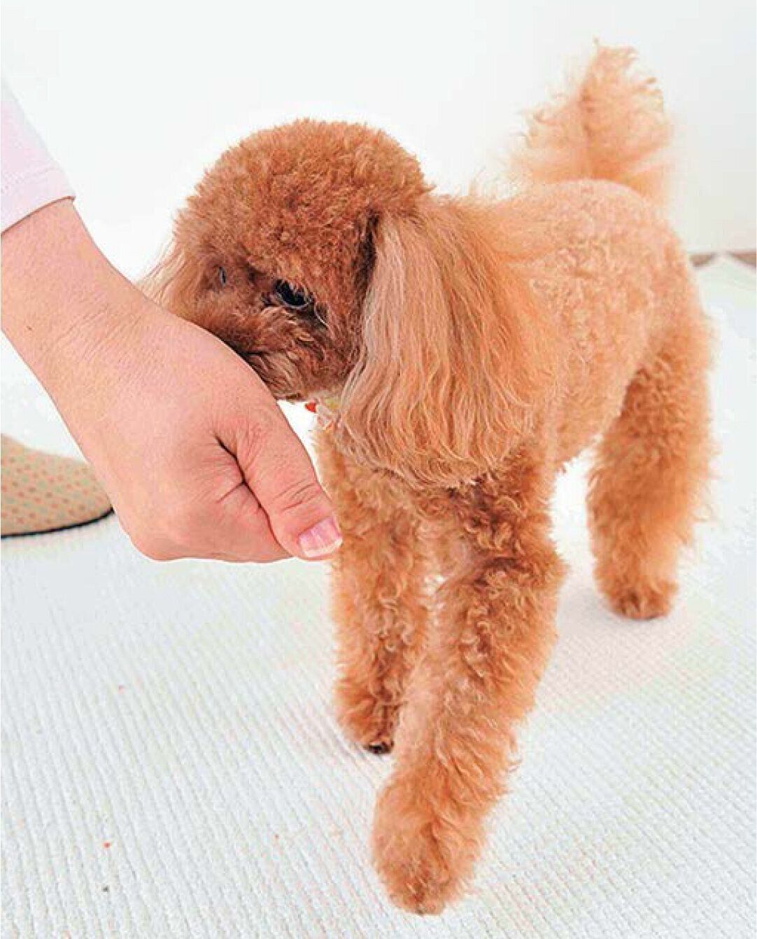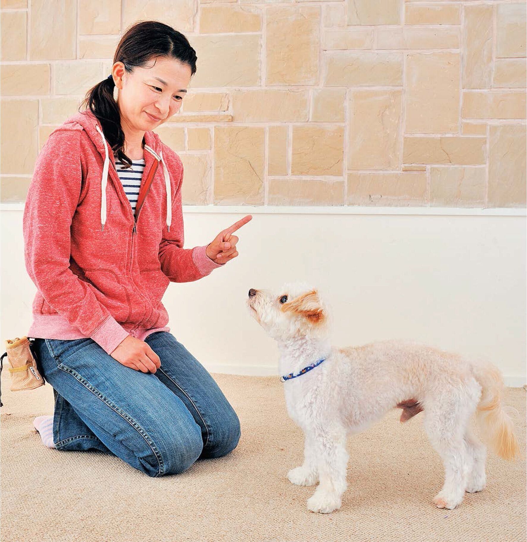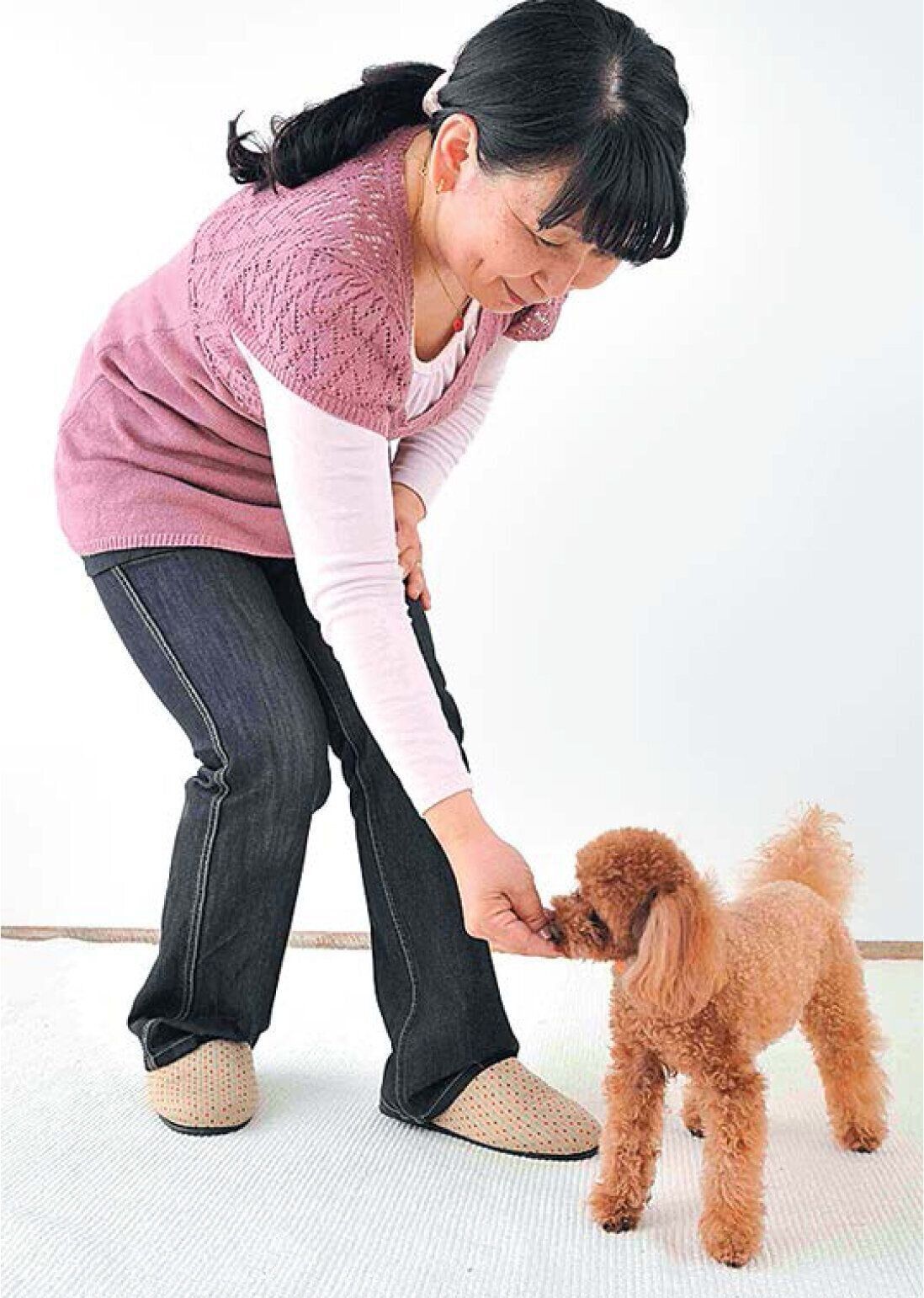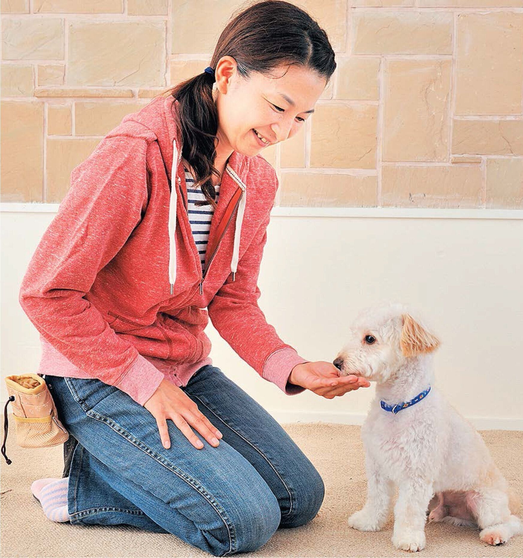 手に握ったおやつのニオイをかがせて、犬の動きをコントロールすることを「誘導」といいます。愛犬の体高に合わせて姿勢を変えるとうまくいきます。