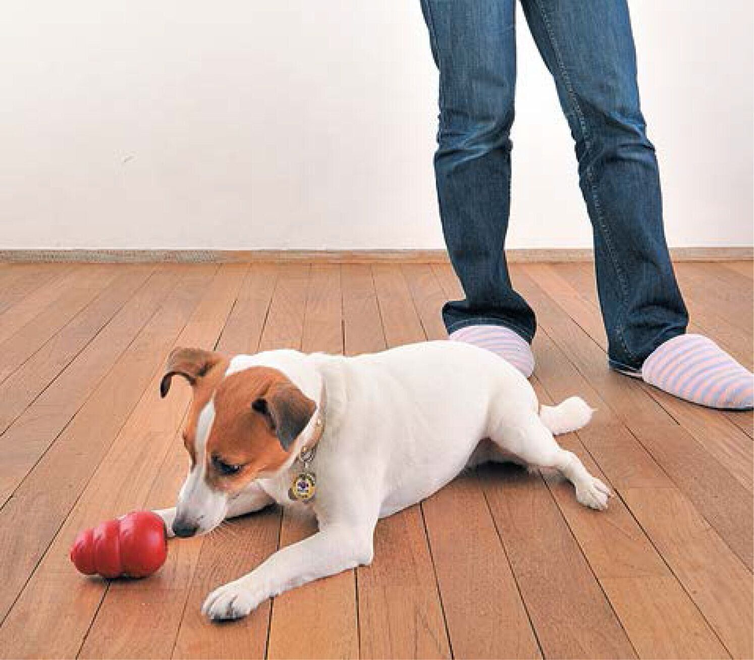 愛犬の目の前に知育おもちゃを置きます。愛犬が気をとられて遊び始めた隙に、その場を離れます。