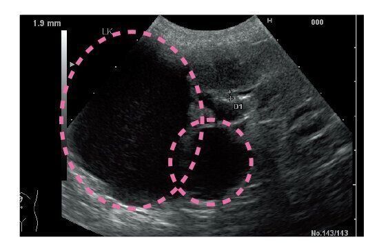 胆嚢は肝臓の隣にある臓器で、肝臓の中でつくられた胆汁をためておく働きがあります。この胆汁がなんらかの原因でベトベトした泥状になり、胆嚢の壁に張りつくのが胆嚢粘液嚢腫です。成犬期~シニア犬期で発症し、進行すると嘔吐や黄疸などの症状が見られますが、初期はほぼ無症状で、血液検査だけでは見つけられません。