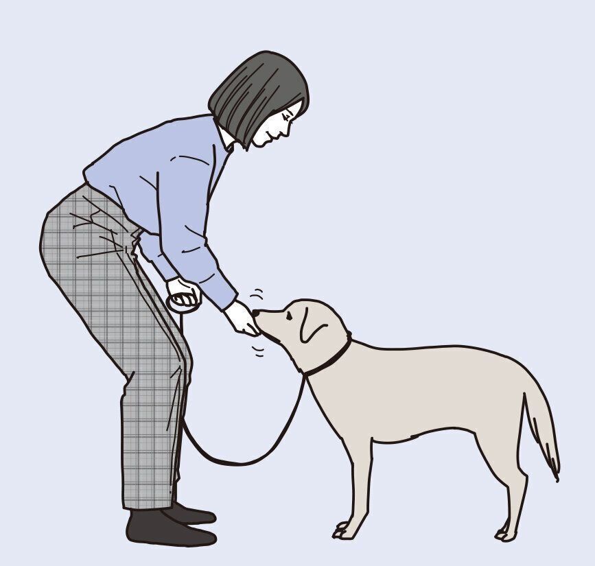 かじらせやすい犬用ジャーキーなどのおやつを握りこんで持ち、ニオイをかがせます。愛犬がおやつをかじり始めたら3へ。