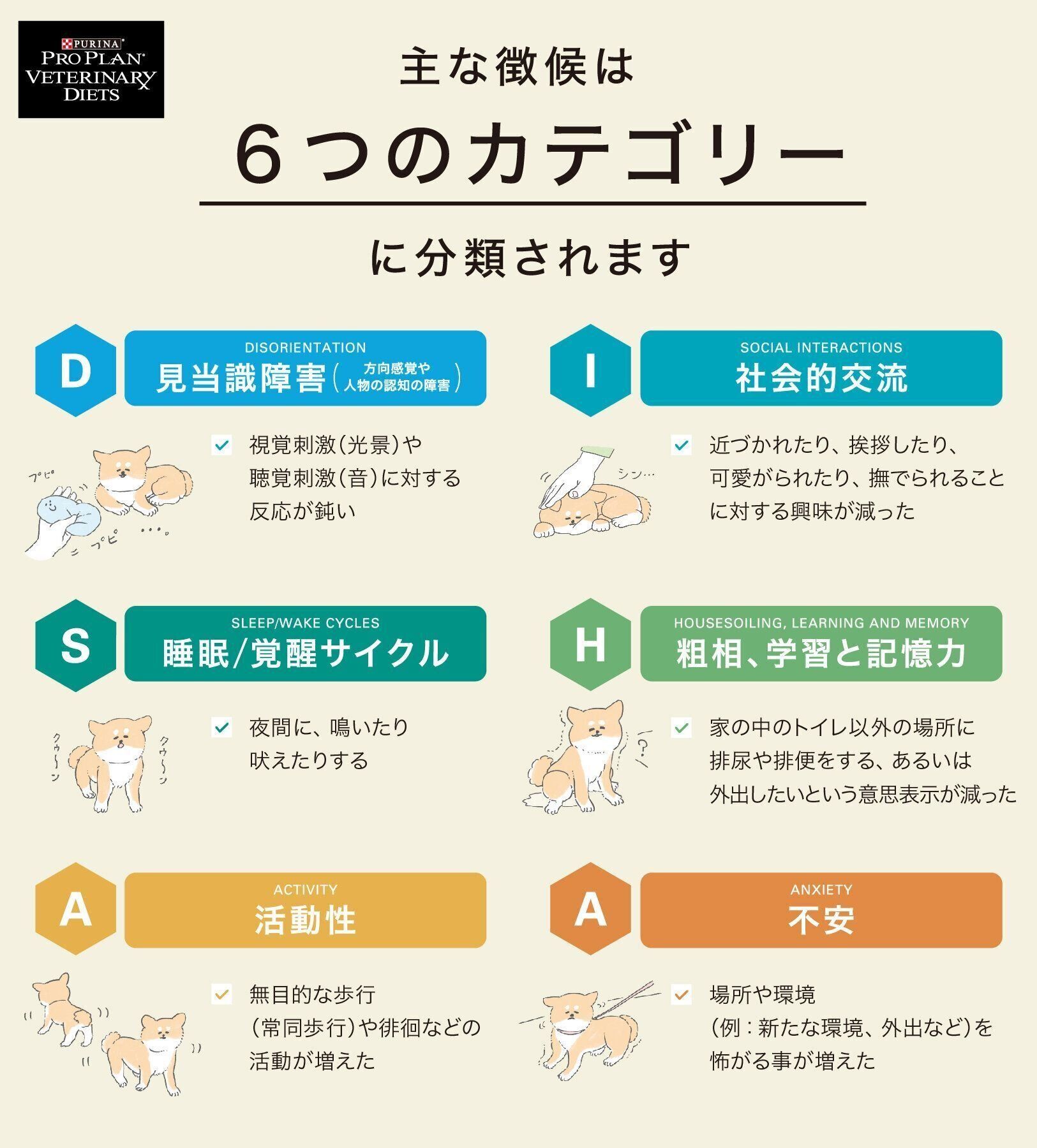 高齢になり認知機能が低下したときに出やすいとされる6つの病状カテゴリーがあります。代表的な18の質問に答えて、愛犬の現在の認知機能を把握しましょう。早い段階から愛犬の状態を確認しておくことで、できる対応を増やすことができます。