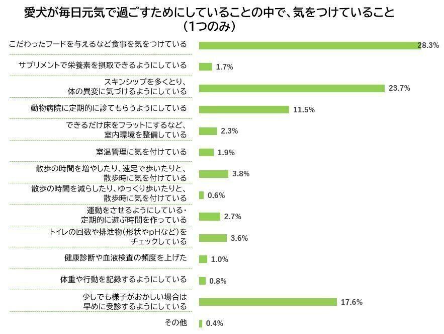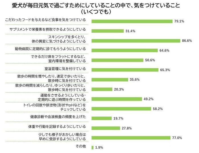 愛犬の長生きのためにしていることとして、どの項目もスコアが高く、みなさんの日頃の意識の高さがうかがえました。スキンシップを通して愛犬の体のチェックをしつつ、日々の食事を管理、少しでも様子がおかしい場合は早めに病院で診てもらう、ということをみなさん心がけているのですね。