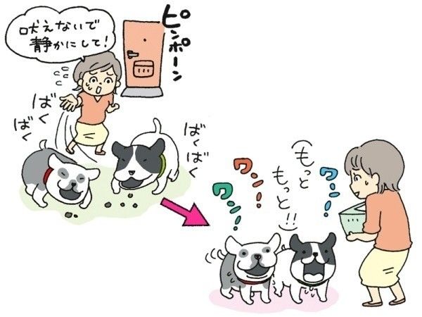 すると、「チャイム=イイコトが起こる」とは学習せずに「チャイムに吠えるとイイコトがある」カン違い。