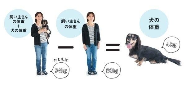 飼い主さんが愛犬を抱っこして体重計にのり、出た数値から飼い主さんの体重を引けば、愛犬の体重がわかります。抱っこを嫌がる犬や大型犬は、動物病院などではかりましょう。