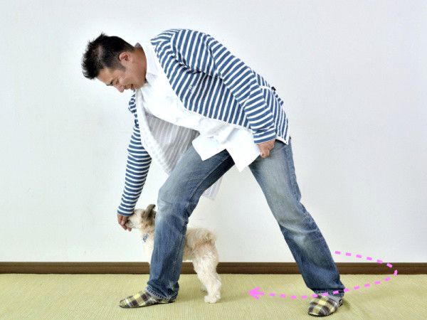 2.前に出す足の膝の裏あたりから同じ側の手で犬を導びく