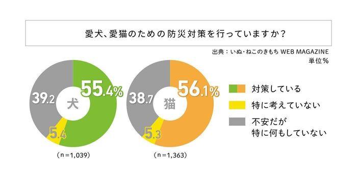 3.11を前に「愛犬・愛猫のための防災対策を行っていますか」という質問をしてみると犬の飼い主さんの55.4%、猫の飼い主さんの56.1%が「対策をしている」という結果となりました。