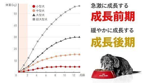 リニューアル製品では、栄養要求が異なるステージ(生後すぐからの子犬用、成長前期の子犬用、成長後期の子犬用)のどのステージを対象にした製品であるかを、より分かりやすく伝えるパッケージデザインに変更されています。