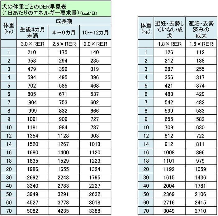 より正確な量を知りたいという場合は、計算してみましょう。犬の1日の「必要エネルギー量(DER)」を計算する方法はいくつかありますが、一般的には「安静時エネルギー必要量(RER)」によって計算する方法が用いられるようです。