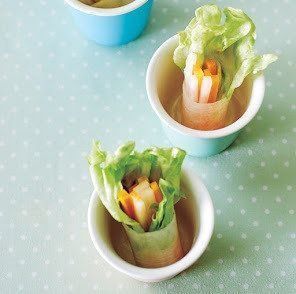 - 2とレタスを、スライスしただいこんにのせて巻いたら完成。