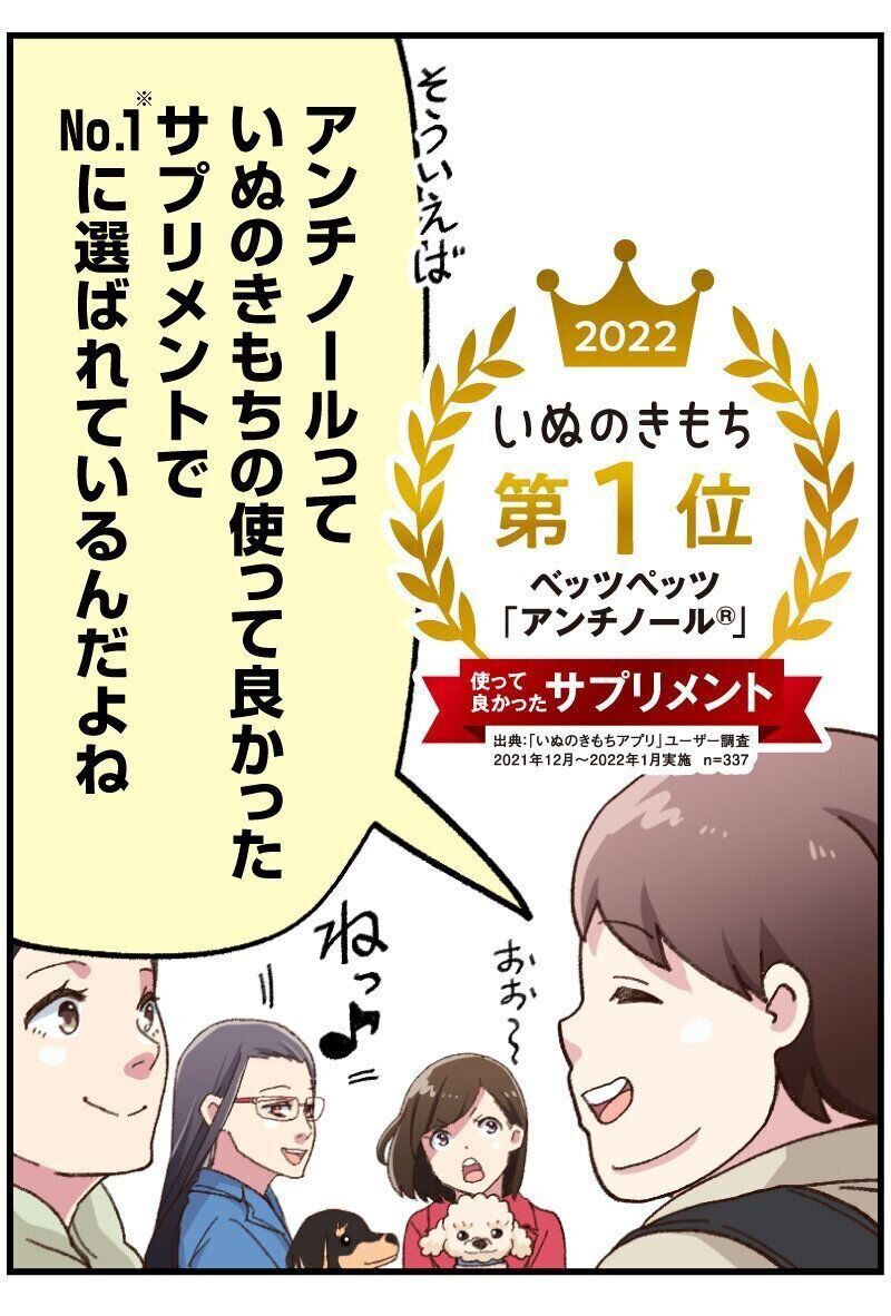 「いぬのきもち」使って良かったサプリメント部門NO.1(※)の「アンチノール®」なら、そんな変化やお悩みとうまく付き合っていくことができます。愛犬のことを「シニアでもう歳だから…」と嘆く前に一度試してみませんか?