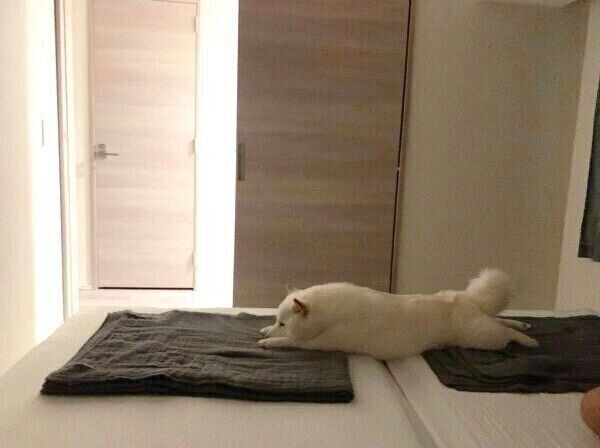 投稿によると「いつもはどちらかだけ」とのことですが、この日のラッキーくんは2台のベッドにまたがり、見事に2枚の布団を占拠していたとのこと。
