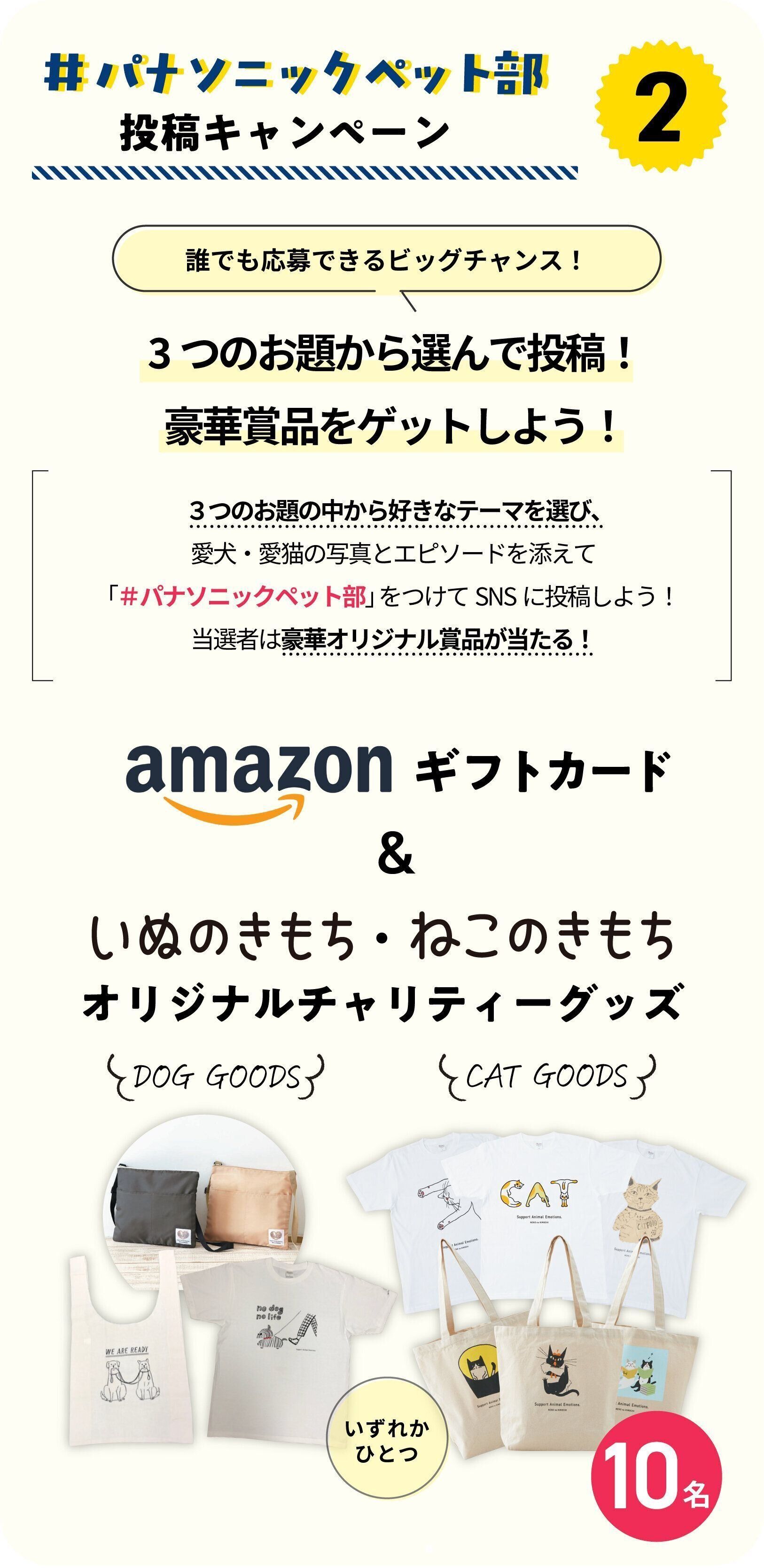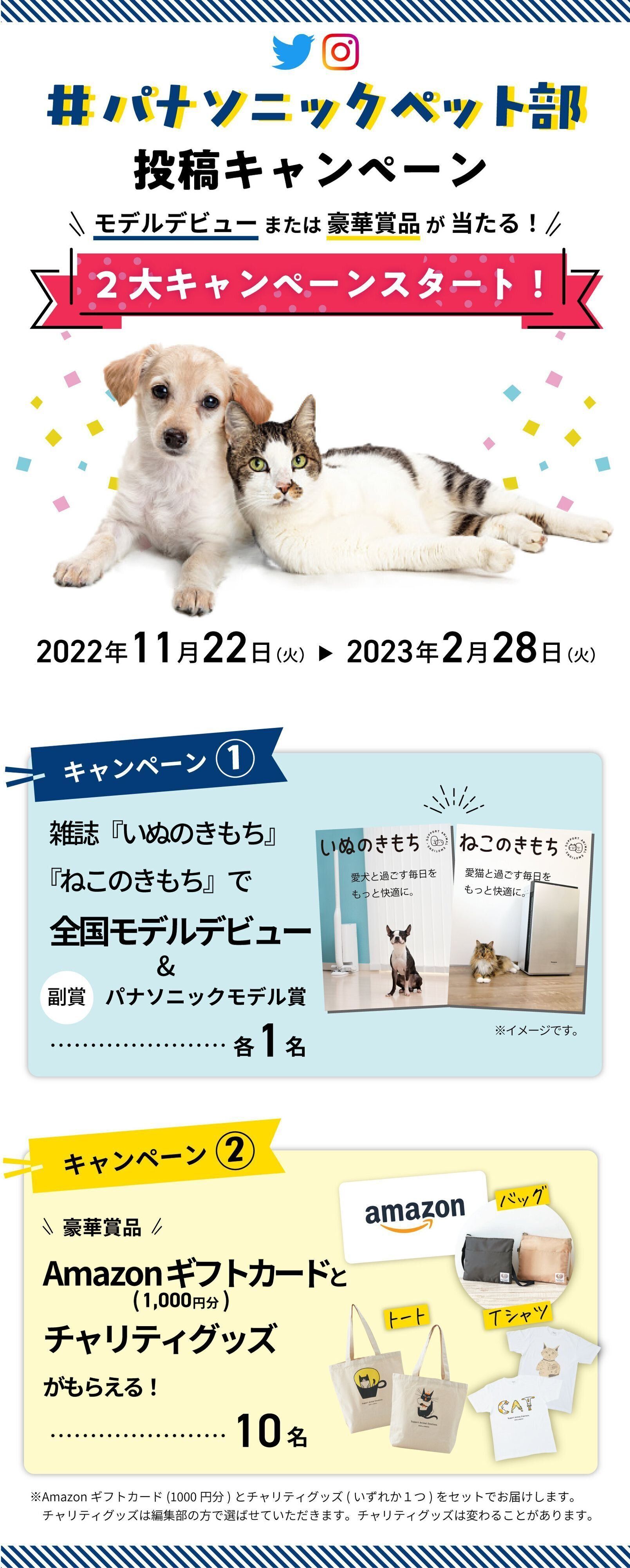 ・当選者にアンケートでご提供いただいた回答内容のうち、パナソニック株式会社の製品に関する回答については、雑誌『いぬのきもち』『ねこのきもち』、「いぬのきもち・ねこのきもちWEB MAGAZINE」やアプリ、および他社配信を含む『いぬのきもち』『ねこのきもち』デジタル版等の媒体、パナソニック株式会社のサイト・広告販促物等におきまして、キャンペーン終了後も掲載させていただく場合があることを予めご了承いただきますようお願い申し上げます。都度の掲載連絡はしませんのでご了承ください。