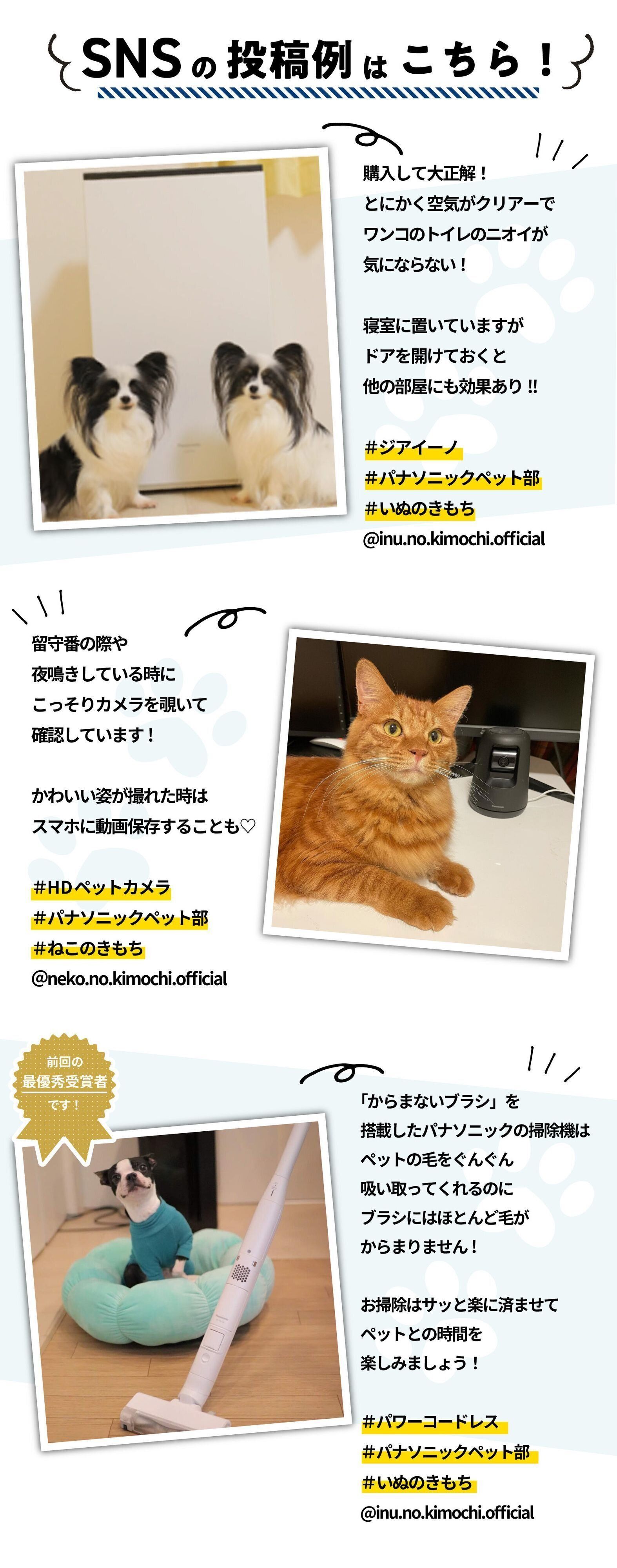 「#対象家電」、「#パナソニックペット部」、「#いぬのきもち」または「#ねこのきもち」、「@メンション」を必ずつけてください。
