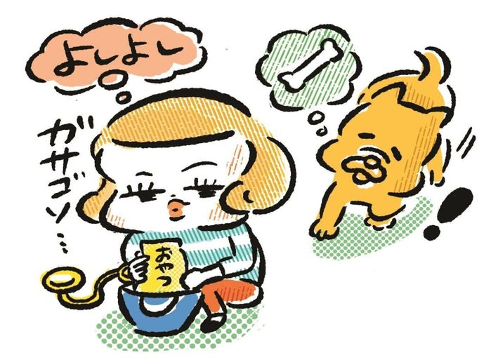 愛犬の名前を呼ぶなどして気をひいたら、愛犬にやや背を向けて、散歩バッグなどをゴソゴソと探ります。このとき、おやつの袋を振って音を出したり、おもちゃを鳴らしたりすると、愛犬が興味をひかれて近づいてきやすいです。