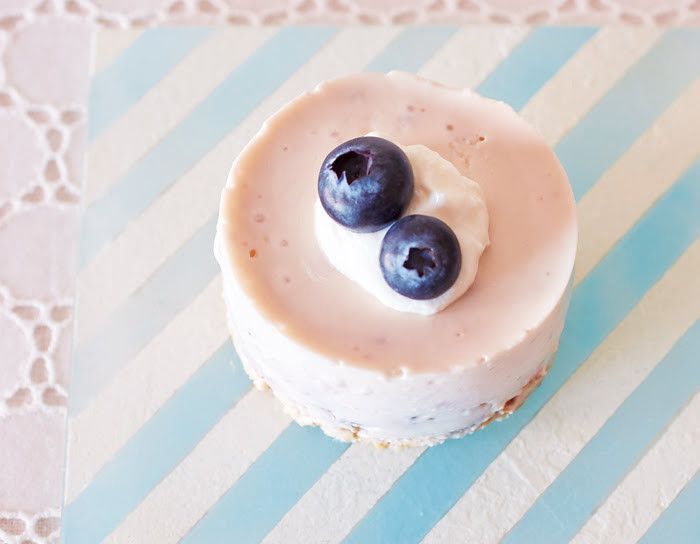 4:セルクルを外したら、飾り用の水切りヨーグルトとブルーベリーをのせて完成。