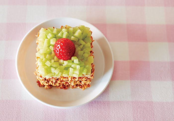 3:木綿豆腐の側面に1をまぶしつけたら、中央にいちごをのせる。いちごのまわりに2を散らしたら完成。