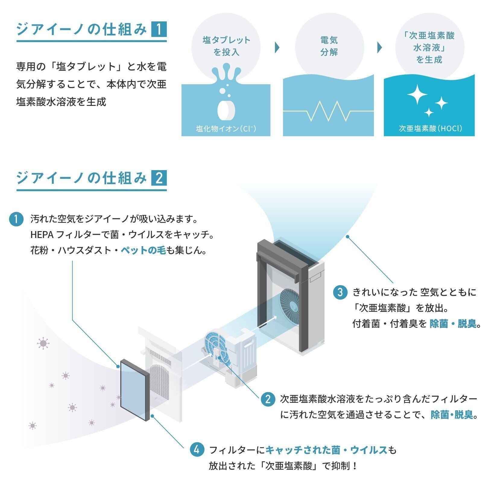 保護エレメント(HEPAフィルター)を搭載し、菌※4・ウイルス※5をキャッチ。花粉やハウスダスト、ペットの毛まで集塵可能!フィルターでキャッチした菌・ウイルスも放出された次亜塩素酸により抑制※6され、徹底した集じんと「次亜塩素酸」により、お部屋の空気をもっときれいに。また、「ジアイーノ」は、清潔空間にうるおいをプラス。除菌・脱臭しながら加湿ができます。