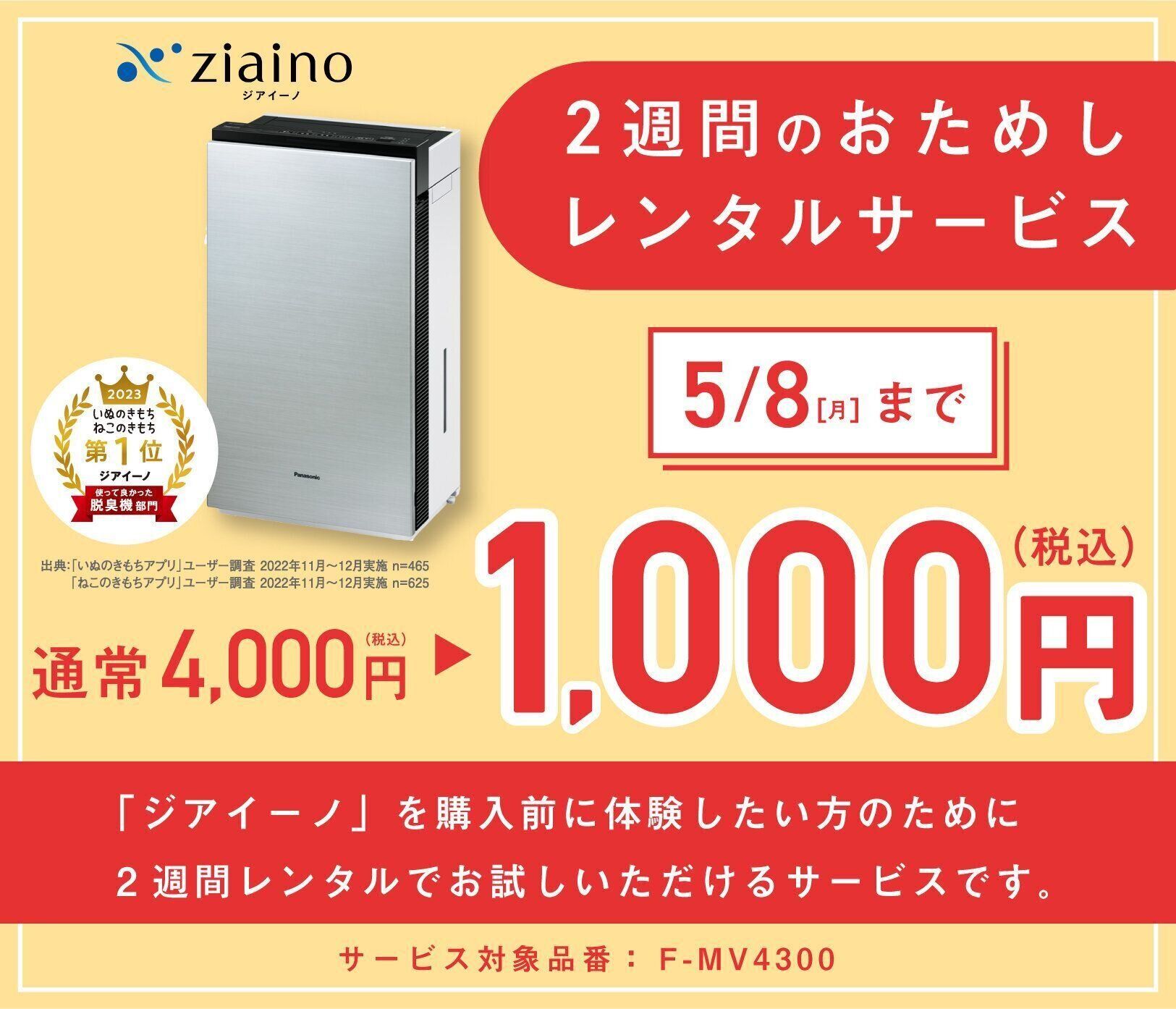 「ジアイーノ」を購入前に体験したい方のために、2週間レンタルで試せるプランをご用意しています。さらに今だけ!通常4,000円(税込)のところ、5/8までの期間限定で1,000円(税込)で利用できます。「ジアイーノ」の効果が気になっているという方は、この機会にぜひお試しください!
