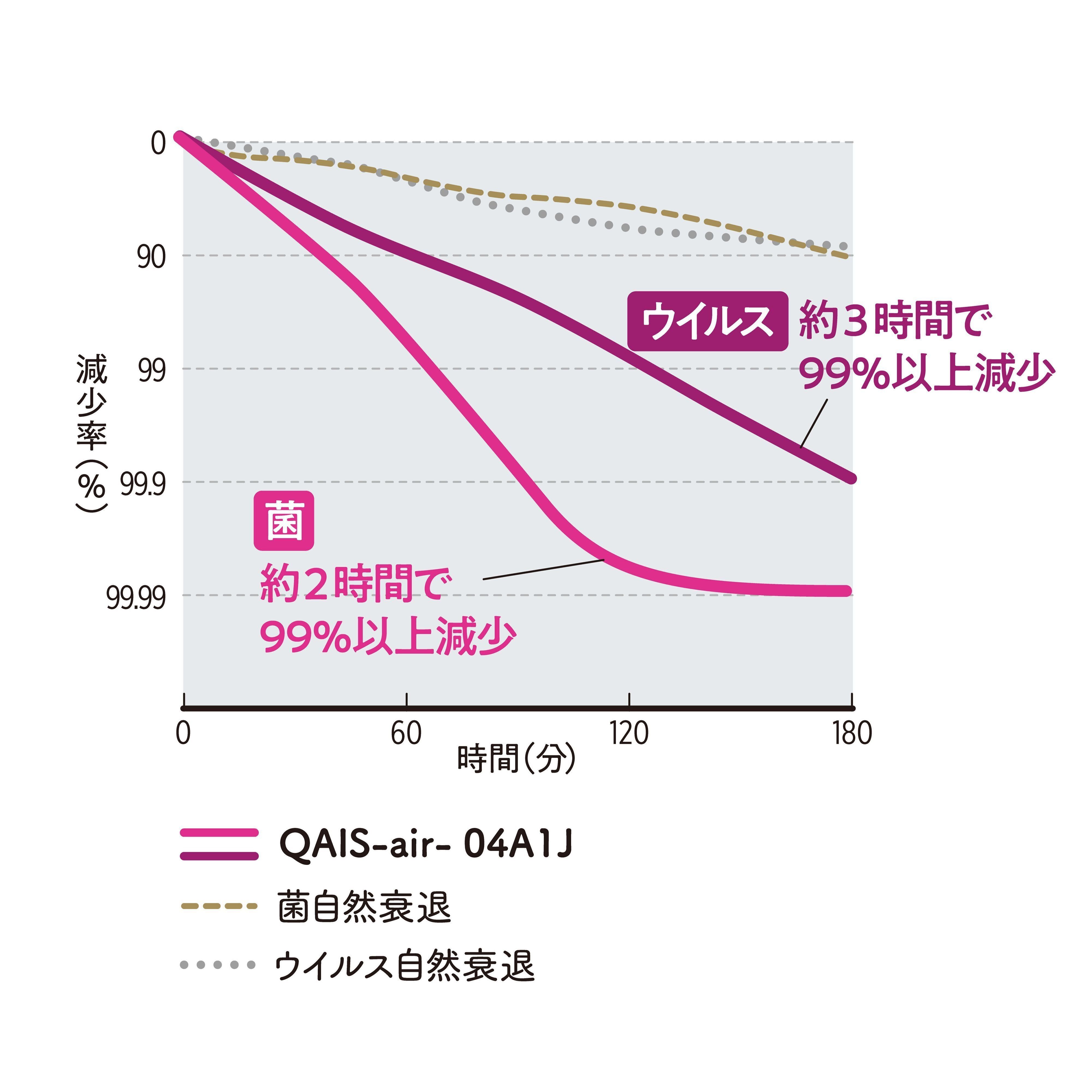 ※本データは疾病に対する予防効果を保証するものではありません。 ※全てのウイルス、菌を除去できるものではありません。 ※装置内に浮遊菌、浮遊ウイルスを取り込んで抑制。※6畳密閉空間における、1種類の浮遊菌に対する約2時間後の効果。 ■試験機関:㈱食品衛生研究所 ■試験方法:約6畳の密閉空間で1種類の浮遊菌数の変化を測定■試験装置:QAIS-air(- 04A1J-OW)を運転 ■試験結果:約2時間で99%以上抑制(報告書番号:217537N-1) ※6畳密閉空間における、1種類の浮遊ウイルスに対する約3時間後の効果。 ■試験機関:㈱食品衛生研究所 ■試験方法:約6畳の密閉空間で1種類の浮遊ウイルス数の変化を測定 ■試験装置:QAIS-air(- 04A1J-OW)を運転■試験結果:約3時間で99%以上抑制(報告書番号:217537N-2) ※装置内に浮遊ウイルスを取り込んで抑制。