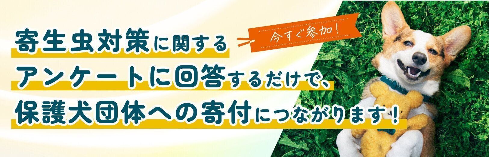 以下のバナーをクリックして、寄生虫対策に関するアンケートにご回答ください。1件につき100円を保護犬団体の支援を行なっているアニマルドネーション様に寄付します。あなたのアクションが、すべての犬の健康につながります。