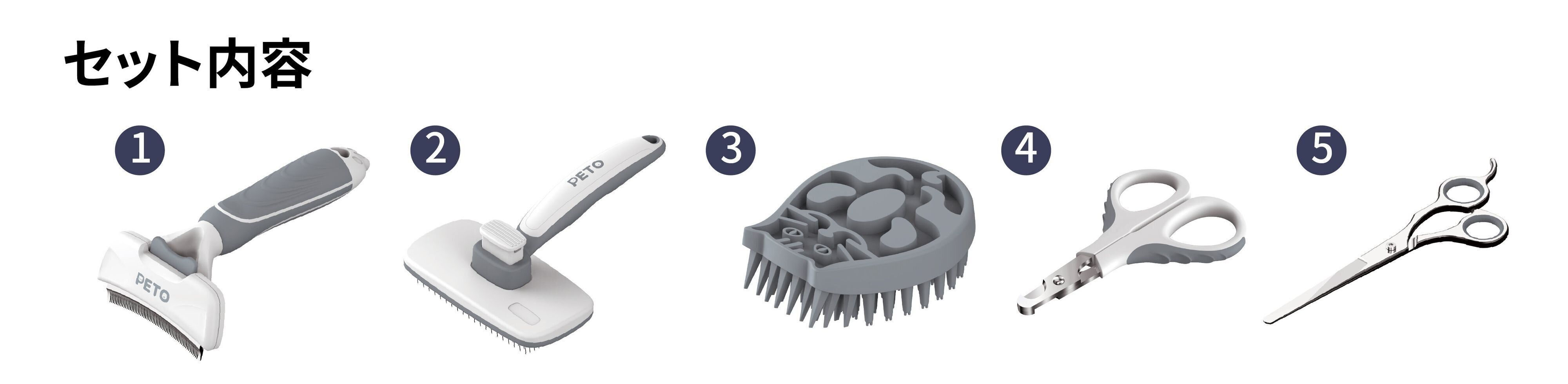 ①ワンプッシュ・カーブブラシ ②ワンプッシュ・スリッカーブラシ ③マッサージ・抜け毛取り用ラバーブラシ ④つめ切り ⑤カット用はさみ