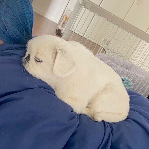 飼い主さんの体温を感じられて、もっちくんは安心しているのでしょう。幸せそうな寝顔で、きっと素敵な夢を見ていることでしょうね!