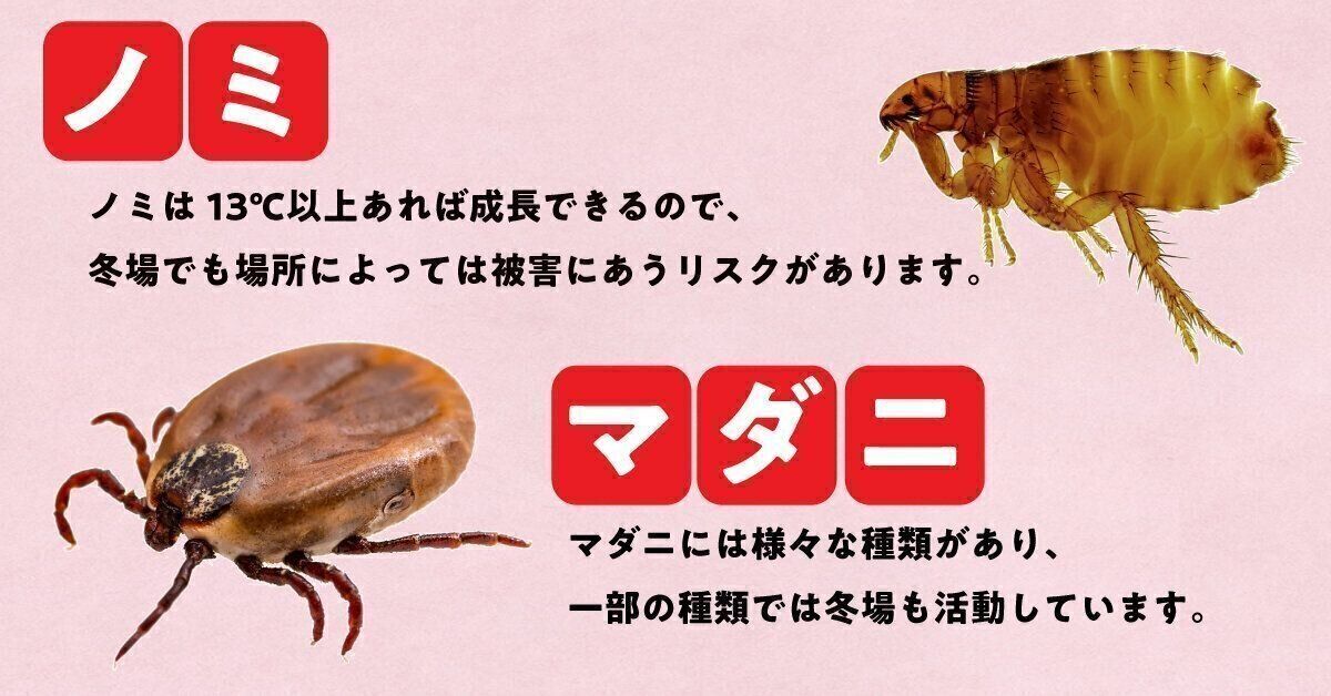 『虫』というと暖かい春先だけ活発にしていると想像しがちですが、ノミもマダニも季節を問わず被害にあう可能性があるので注意しましょう!