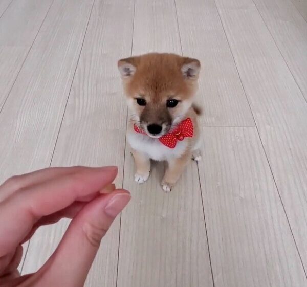 真剣な表情でお座りをしながら、小さなしっぽをフリフリするあまちゃん。おりこうさんに待っている様子が可愛いですね!