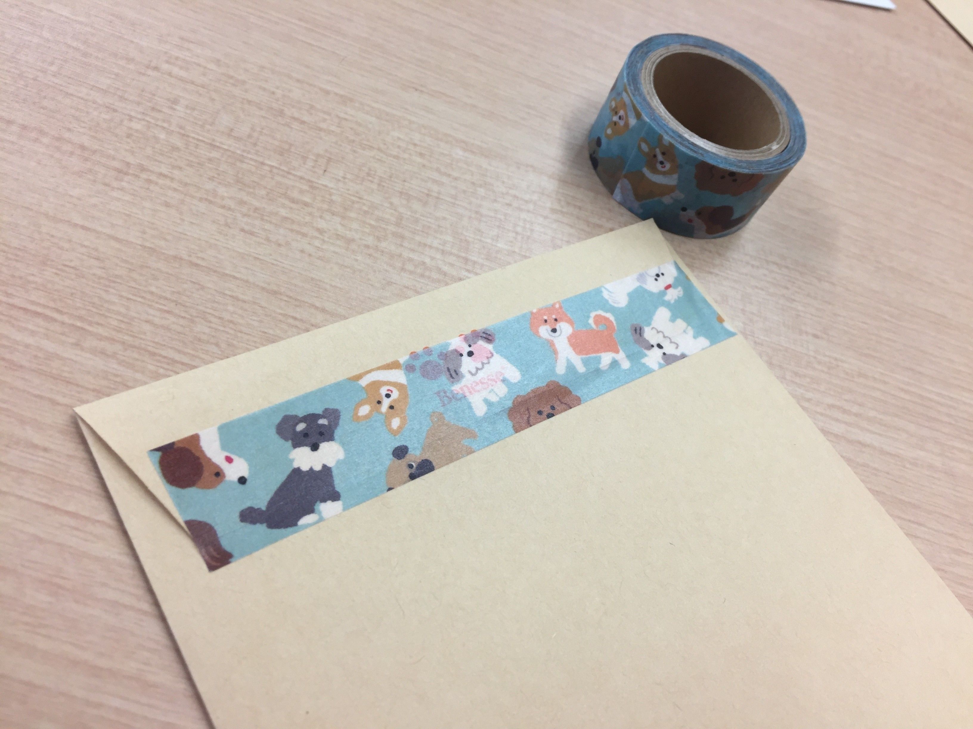犬のイラストが入ったテープ。こんな風に封書につかえば、犬好きなら思わず開ける前に笑顔になれますね♪ 犬好きの取引先相手や犬好きの友達がいたら、ぜひこういったテープを使ってみてください。会話も増えて関係性アップになる可能性大です!
