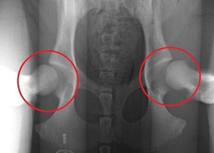 早期発見のためのエックス線検査で発見された股関節形成不全の例。円内の股関節にゆるみが見られます(症例写真提供/南 直秀先生)