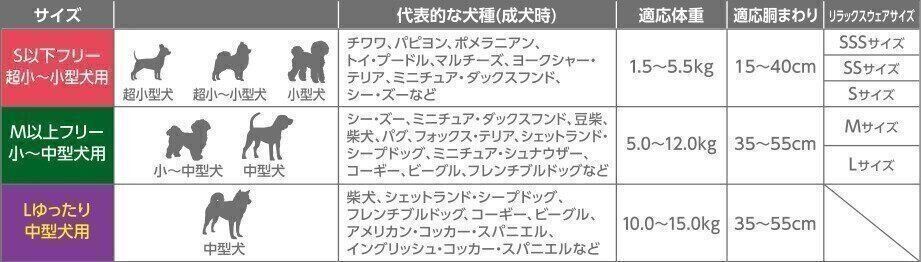 今回は、この3種類のサイズを無料サンプルでお試しいただけます。下記のサイズ表を確認いただき、愛犬にぴったりのサイズを選んでみてください。