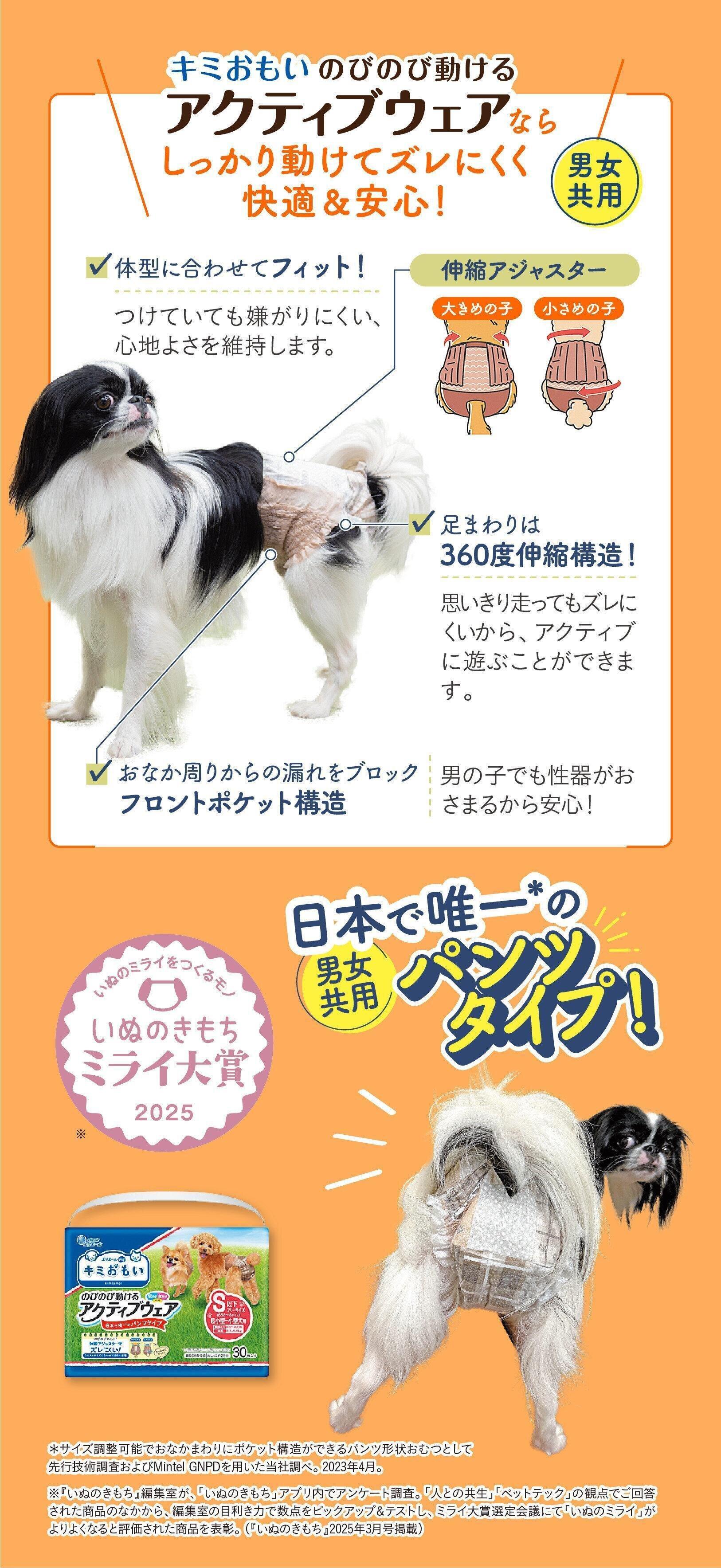 ニコちゃんがはいているエリエールPet キミおもい「のびのび動けるアクティブウェア」は濡れにくくフィット感も抜群。万が一、オシッコやマーキングをしてもしっかりキャッチするから、お部屋以外の場所でも自由に探索を楽しめます。
