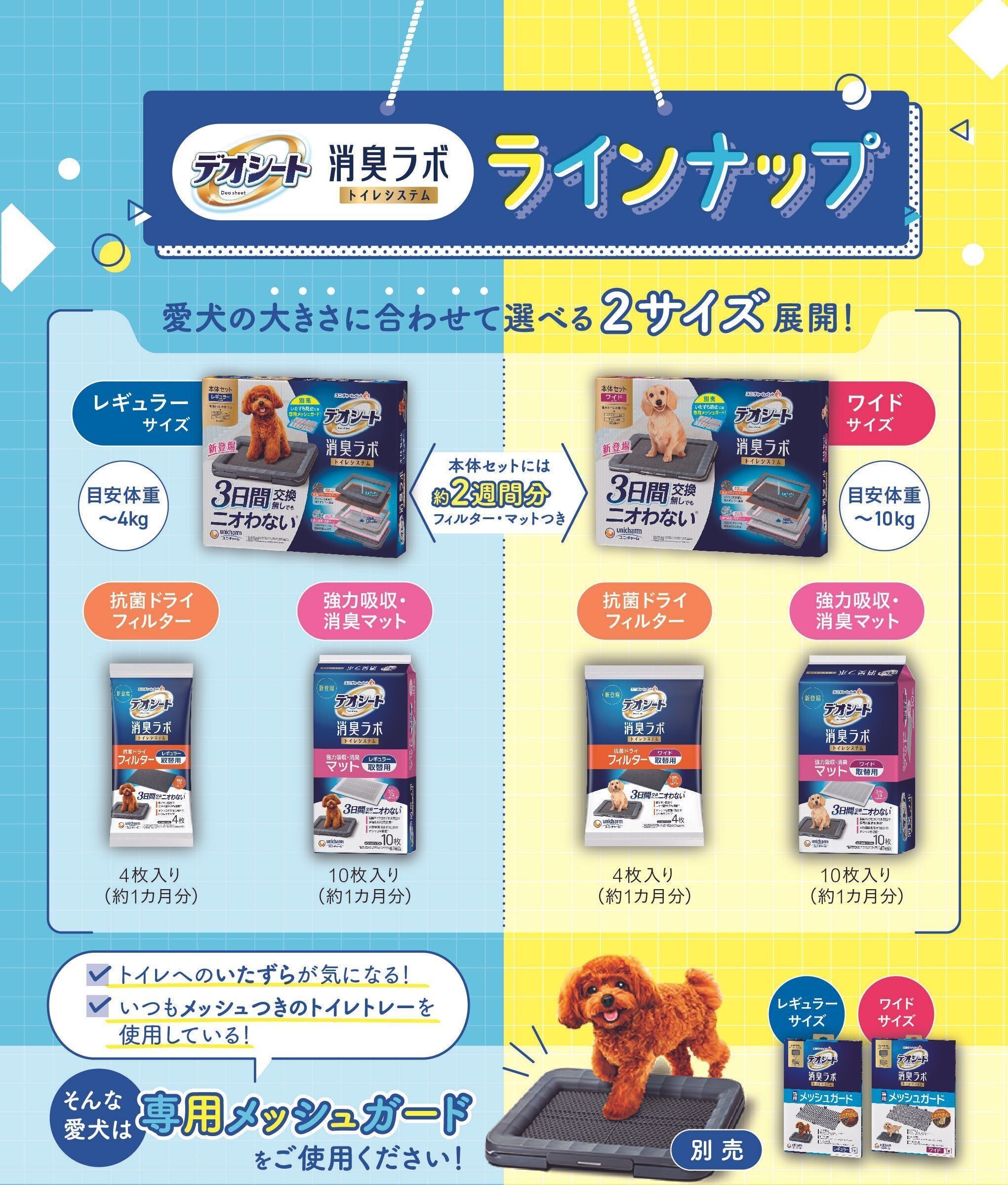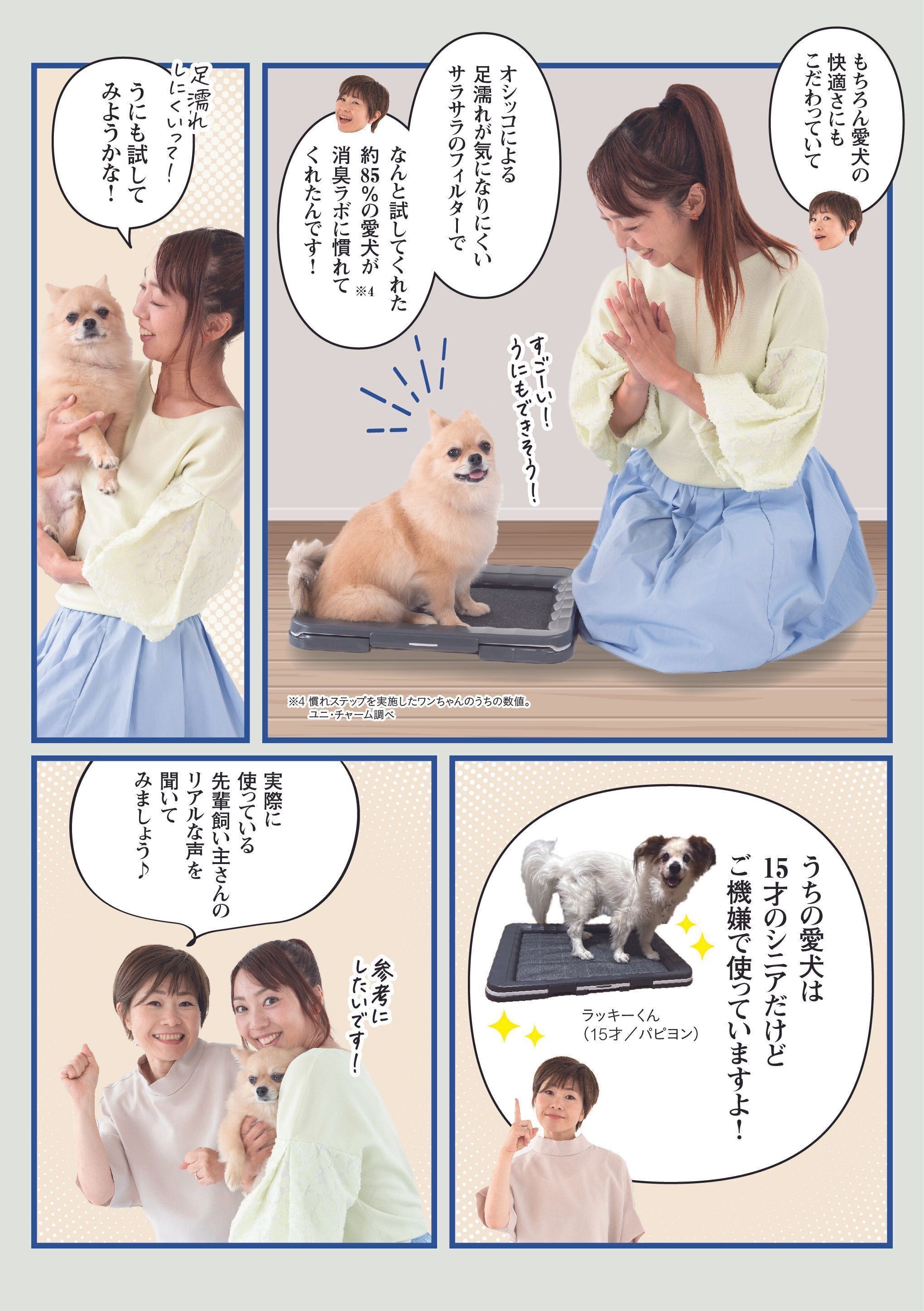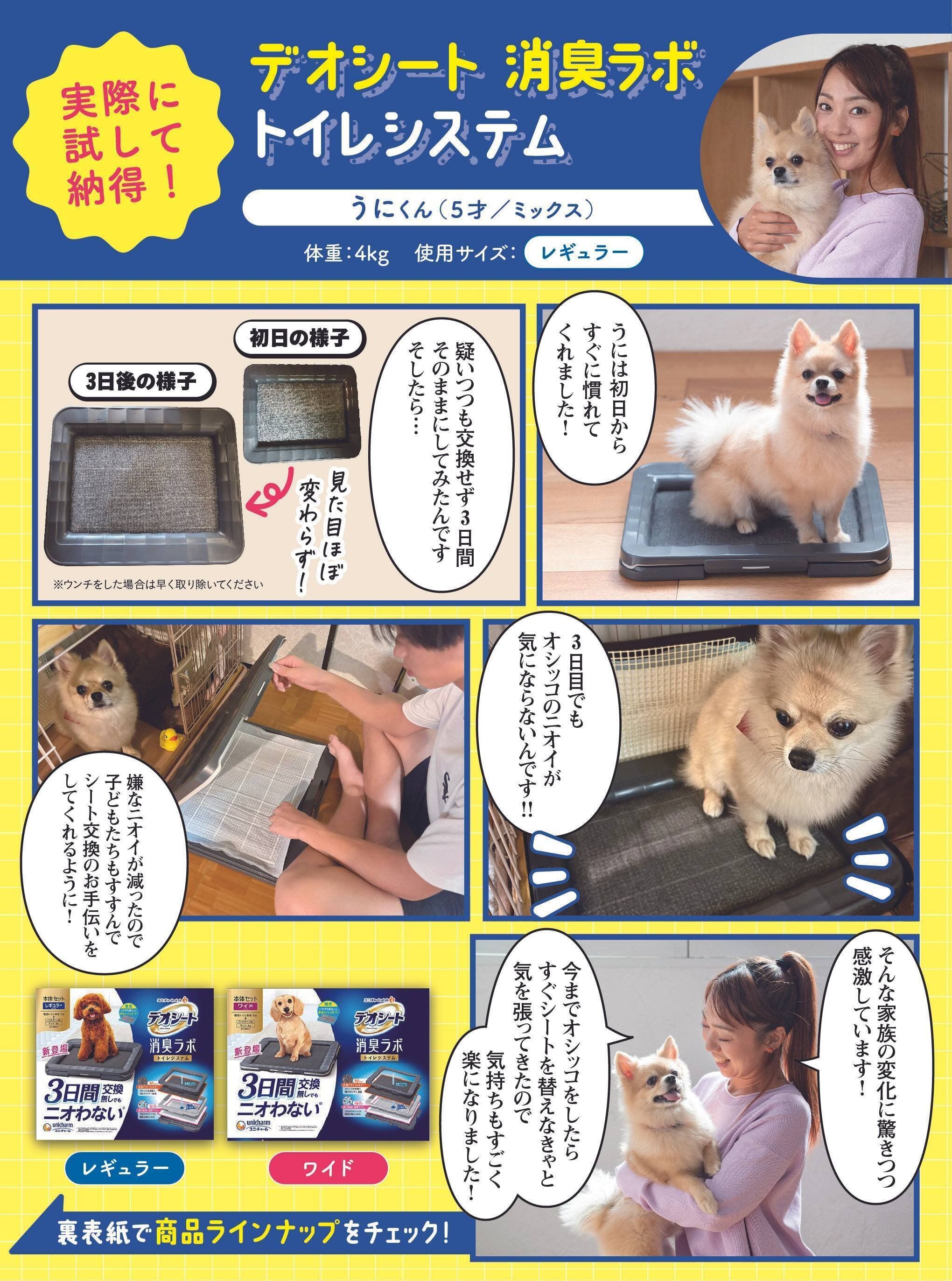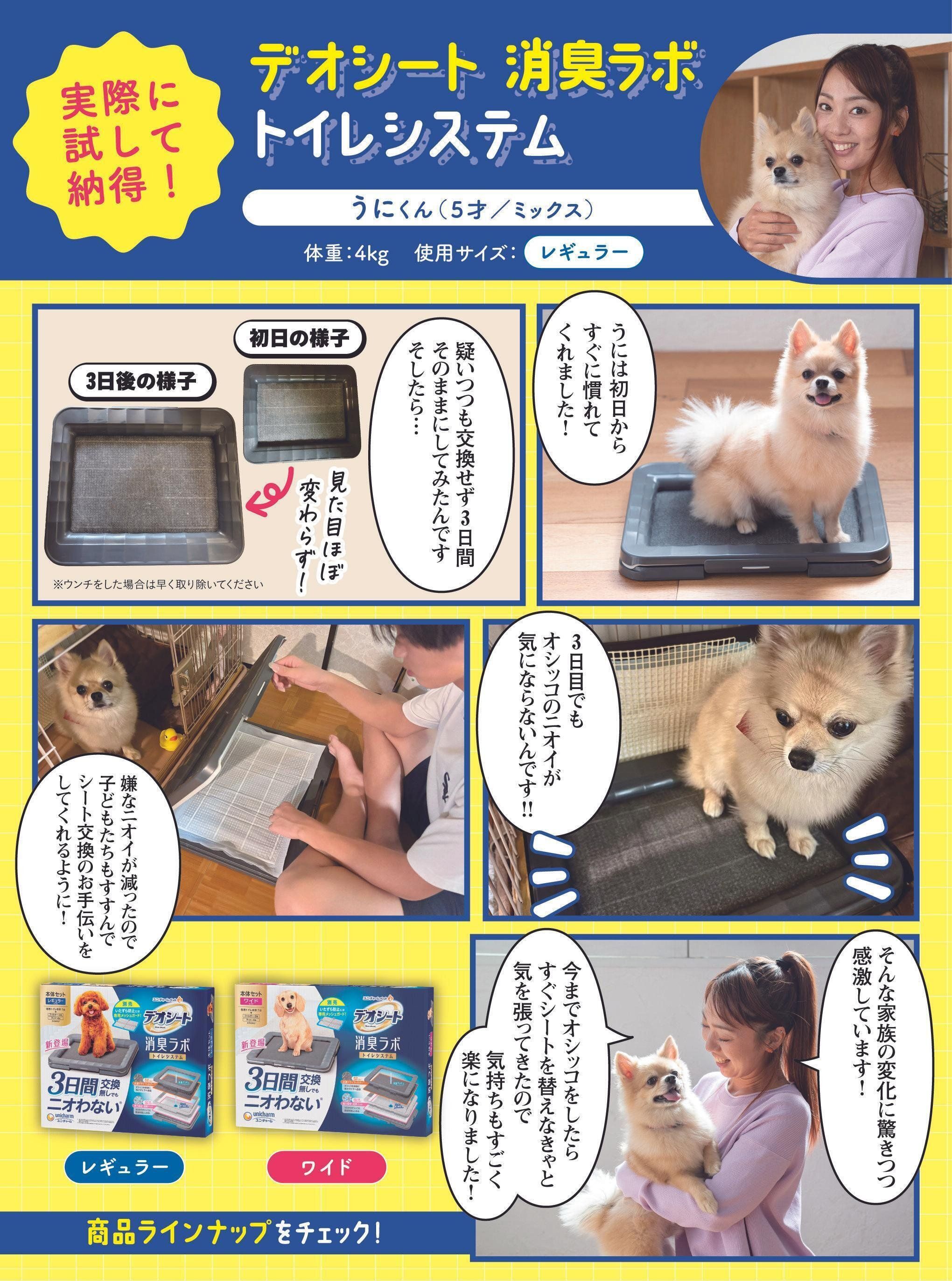 ※1 愛犬1頭(レギュラー4kg以下、ワイド10kg以下)の尿吸収時。ウンチをした場合は早く取り除いてください。普段の生活での消費者テストにて「3日間マットがニオわない」と回答した消費者87.9%。閉鎖空間にて1日1回20ccの犬尿を滴下した後での3日後の臭気判定士による臭気強度・快・不快度評価を実施、また、20ccの犬尿を滴下した後の3日後のアンモニア濃度評価を実施 ユニ・チャーム調べ