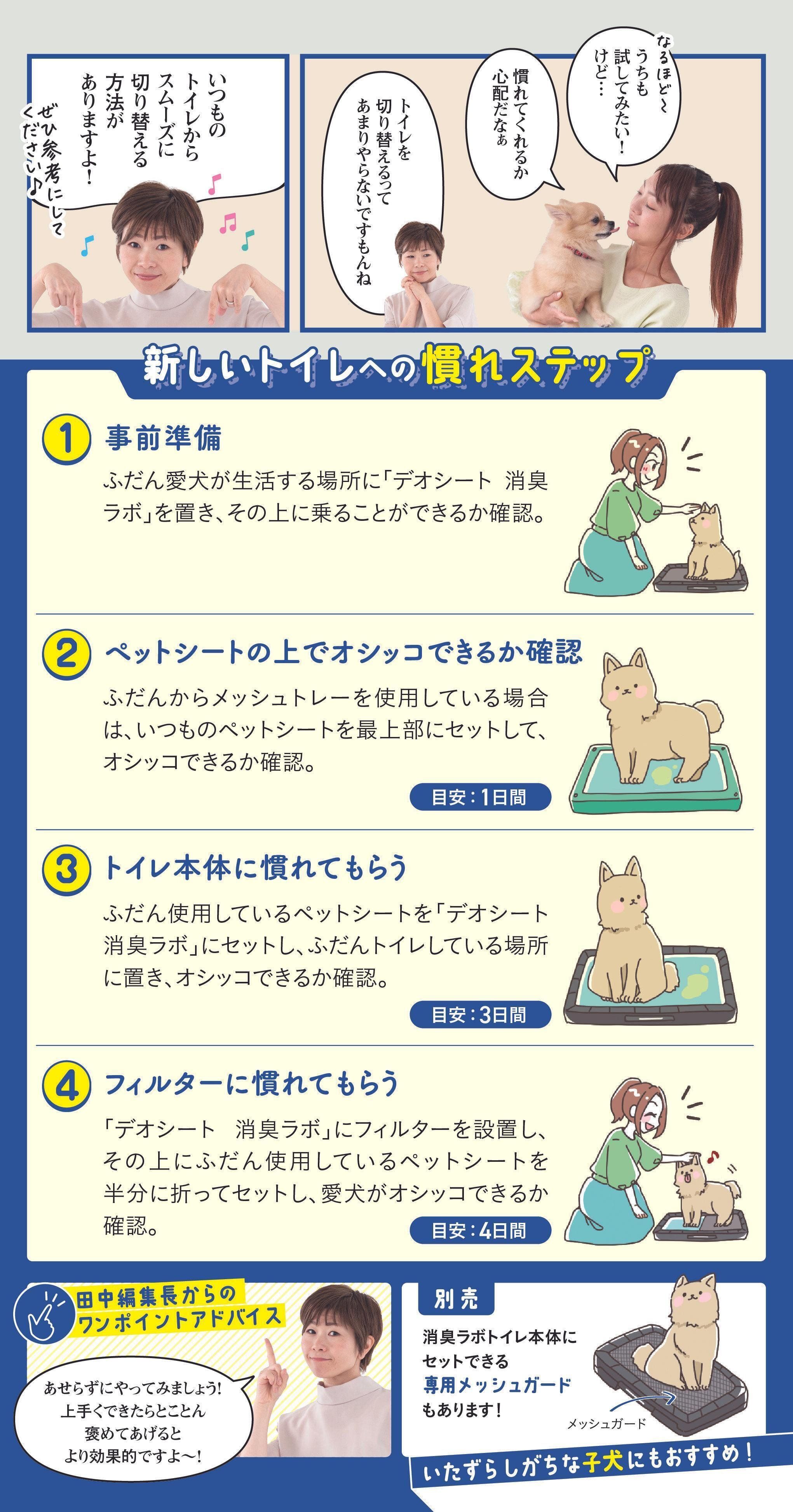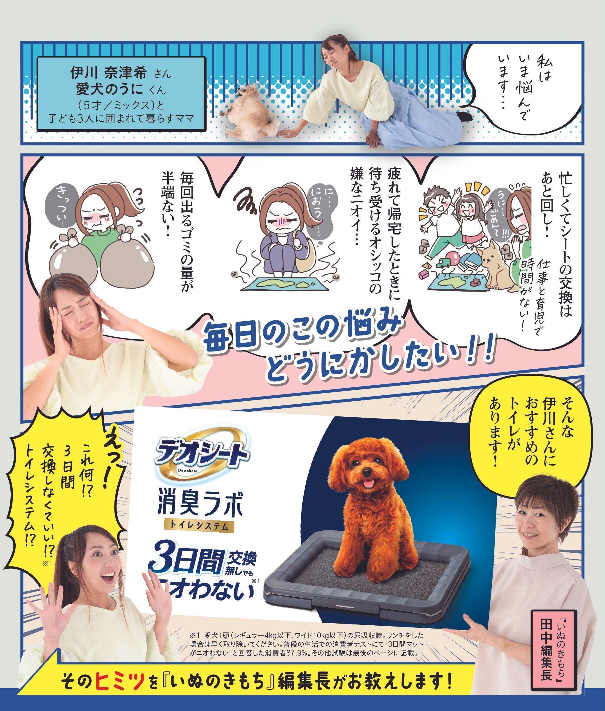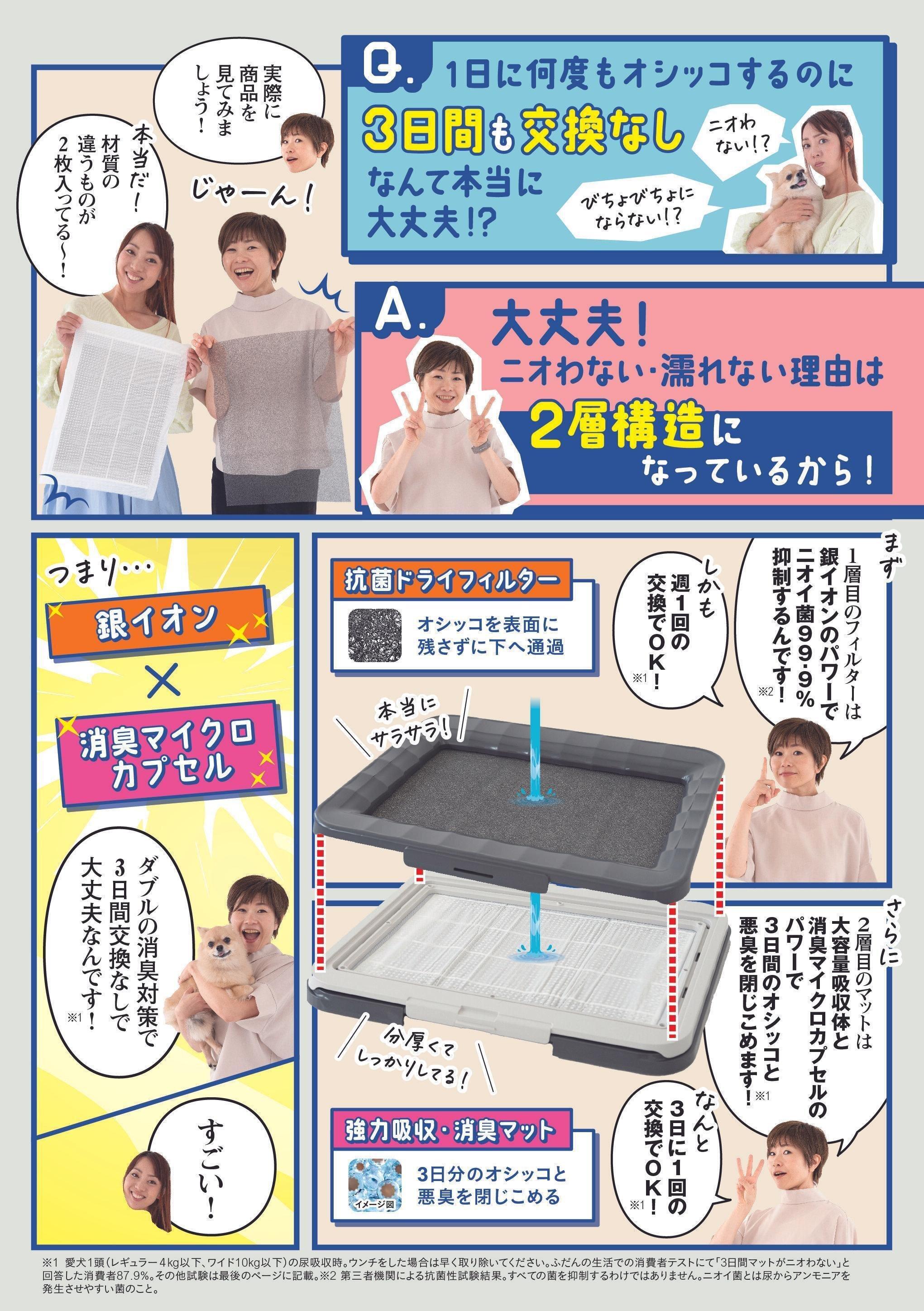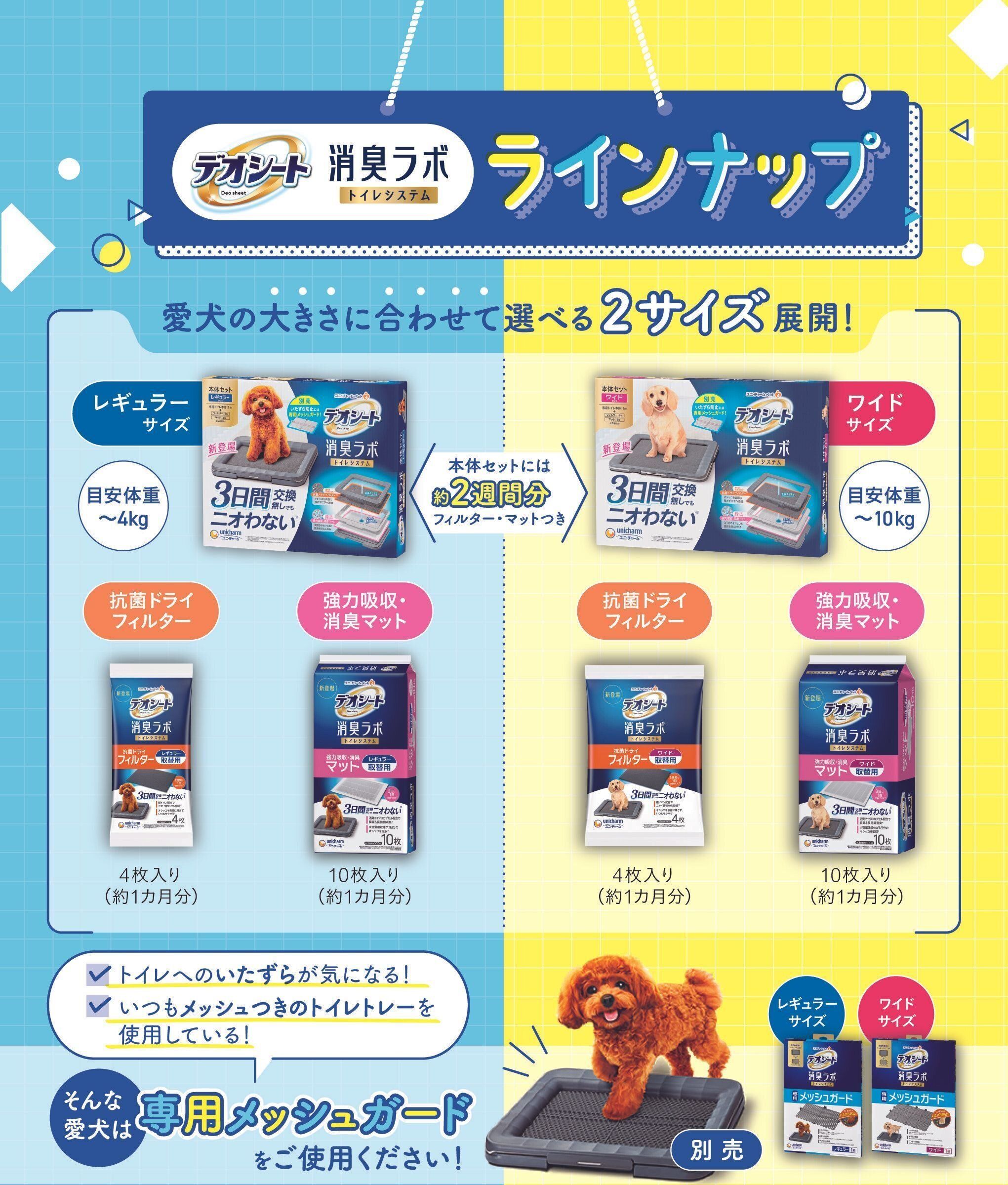 ※1 愛犬1頭(レギュラー4kg以下、ワイド10kg以下)の尿吸収時。ウンチをした場合は早く取り除いてください。普段の生活での消費者テストにて「3日間マットがニオわない」と回答した消費者87.9%。閉鎖空間にて1日1回20ccの犬尿を滴下した後での3日後の臭気判定士による臭気強度・快・不快度評価を実施、また、20ccの犬尿を滴下した後の3日後のアンモニア濃度評価を実施 ユニ・チャーム調べ