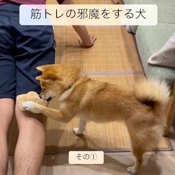「筋トレを始めると、すずはほぼ100%おもちゃを持ってきます。旦那は、初めてすずがおもちゃを持ってきたときは笑ってしまい、力が入らずに筋トレどころじゃなかったと話しています。