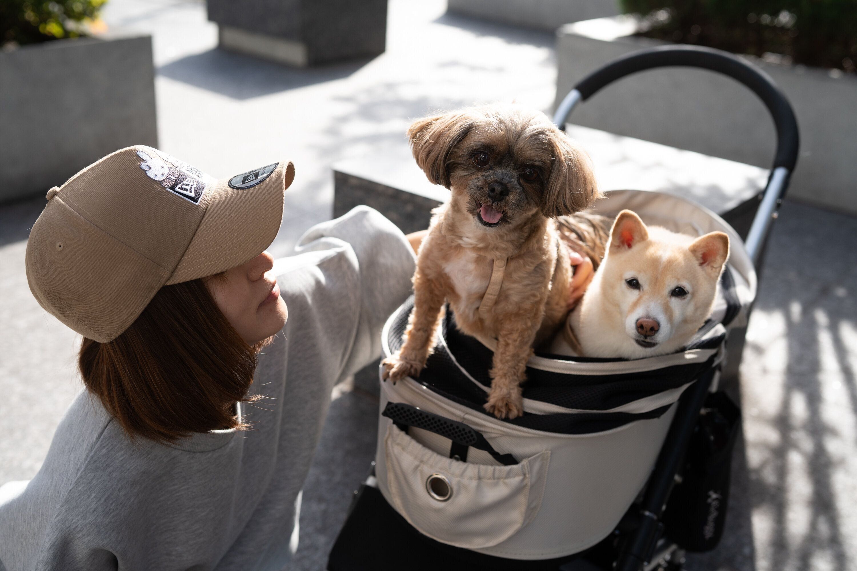 ときどきペット用のバギーにハンディファン(扇風機)をつけている飼い主さんがいますが、犬は汗をかかないので、皮ふから出た汗に風が当たって水分が蒸発することによる気化熱は発生しません。ただただ熱風を浴びせてしまうことになります。