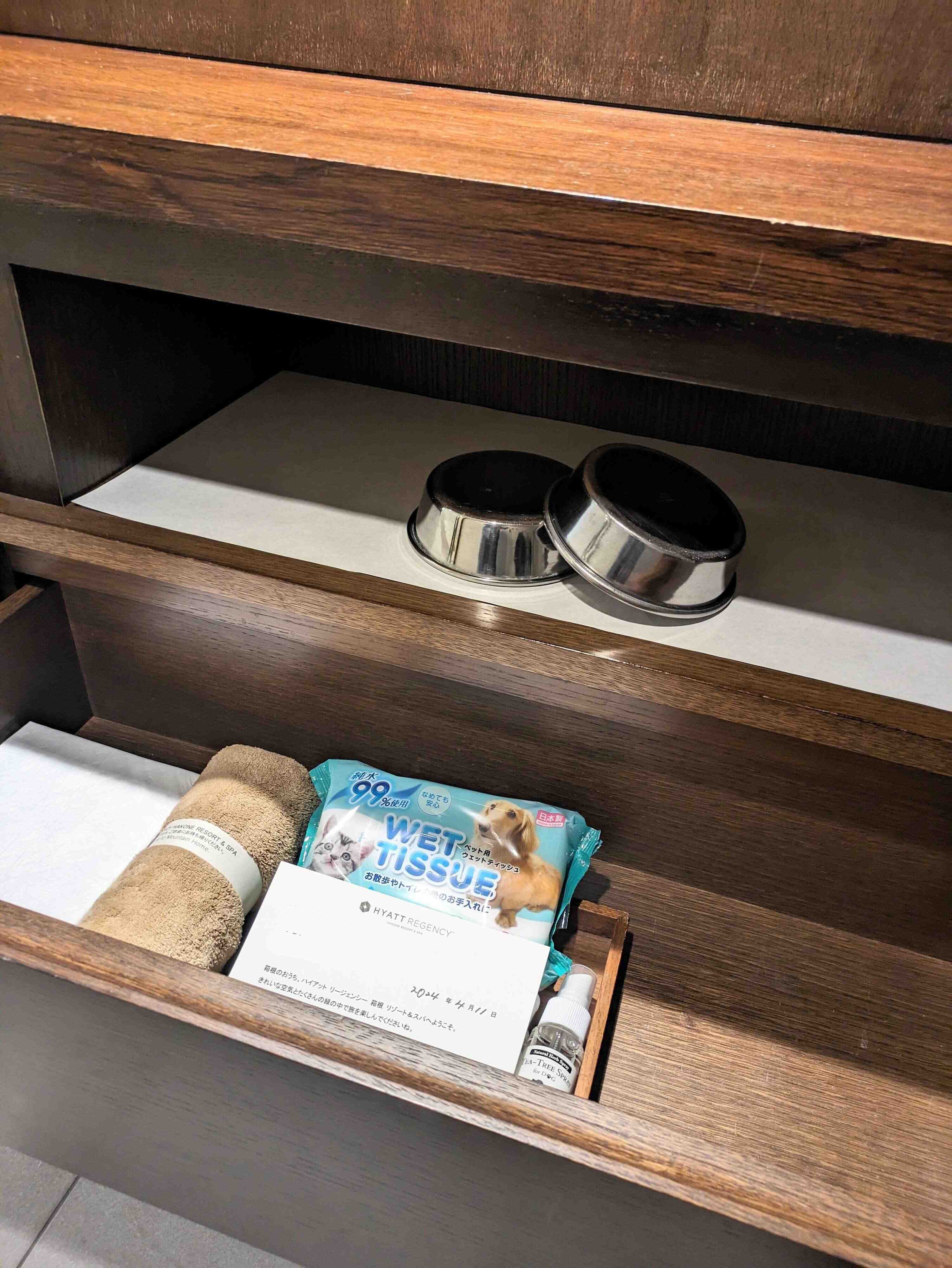愛犬用のアメニティも充実。フードボウル、ペットシート、タオルなども完備されているので手ぶらでもOK。実際、私も自宅から持参したアイテムはほとんど使わずに済みました。